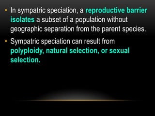 It is the evolutionary process by which organisms are created from a single ancestral species while occupying the same geographical area. Occurring in the same area. Type of speciation that.